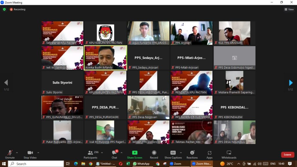 Selain itu, pada Selasa (5/9) pagi, KPU Pacitan mengumpulkan seluruh PPK dan PPS berikut sekretariatnya se-Kabupaten Pacitan. Momen tersebut bertajuk rakor tahapan Pemilu Tahun 2024. Karena jumlahnya yang terlampau banyak, rakor tersebut dilakukan secara dalam jaringan (daring). Menggunakan aplikasi zoom.