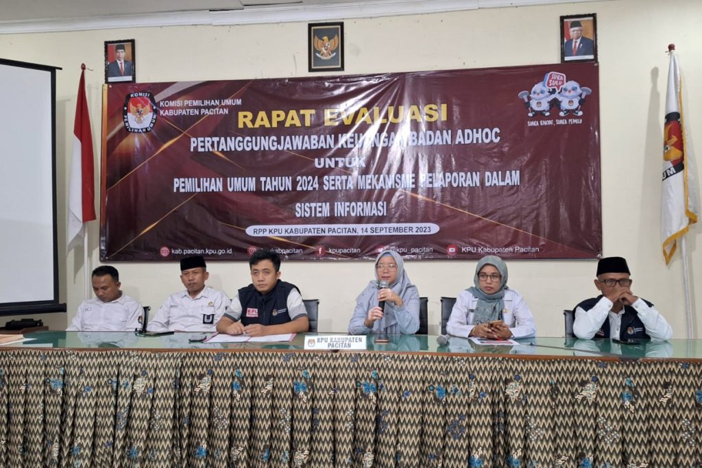 Pada Kamis (14/9), KPU Pacitan kembali mengundang ketua, sekretaris dan bendahara PPK se-Pacitan. Mereka dikumpulkan dalam tajuk rapat evaluasi pertanggungjawaban keuangan badan adhoc dan mekanisme pelaporan dalam sistem informasi. Forum ini diawali dengan pengarahan dari masing-masing anggota KPU Pacitan.