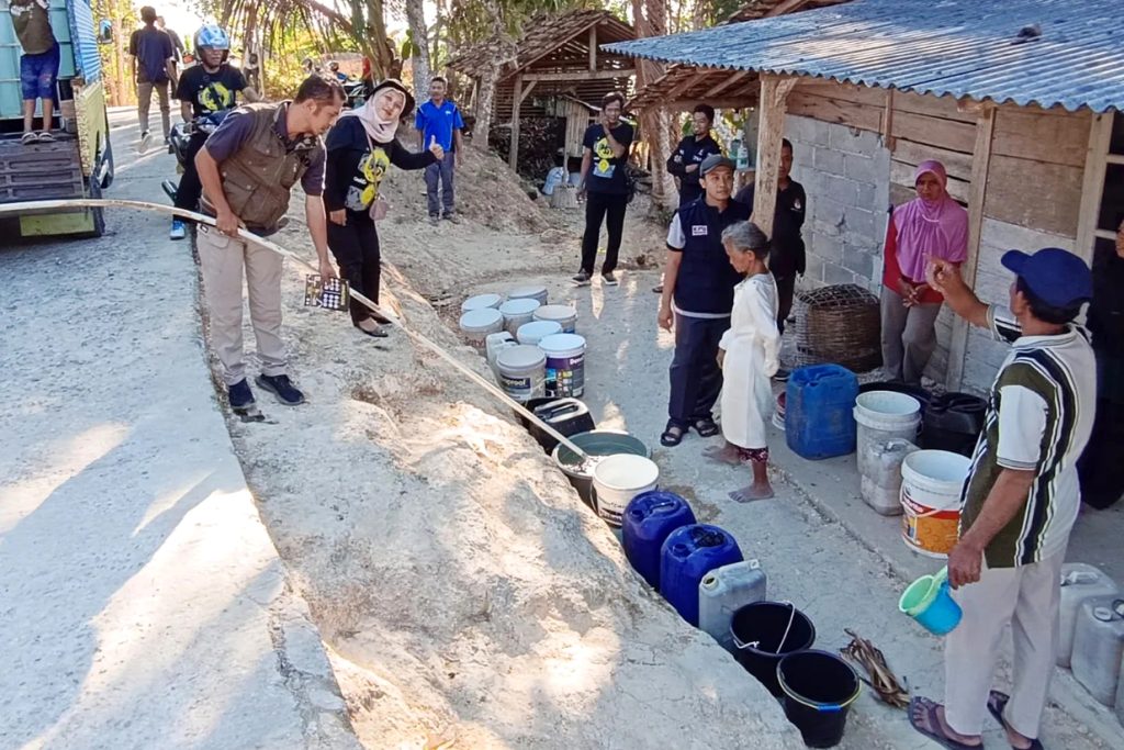 Menuju lokasi, saya dibonceng motor anggota PPS. Dipandu oleh perangkat setempat. Di lokasi penyaluran bantuan, sudah berjajar tempat penampungan air yang disiapkan warga. Mulai ember, jeriken, hingga penampungan air lainnya. Menurut salah seorang warga, bantuan tersebut baru kali pertama didapatkannya. Apabila tidak ada bantuan, mereka hanya mendapatkan giliran penyaluran air bersih tiap seminggu sekali.