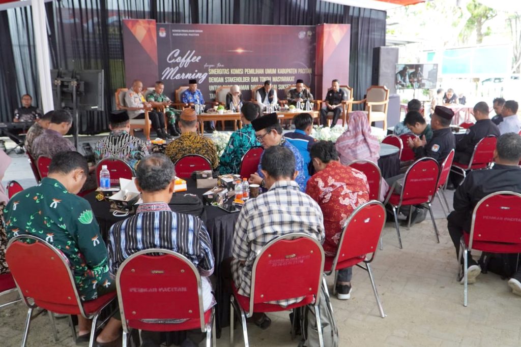 Agenda lain KPU Pacitan dalam pekan kemarin, adalah coffee morning. Digelar Rabu (29/11) di halaman kantor KPU Pacitan. Sejumlah pihak diundang. Selain Pemkab dan jajaran Forkopimda, juga diundang stakeholders terkait. Termasuk sejumlah tokoh. Mulai tokoh agama, tokoh adat, tokoh pendidikan, serta teman-teman ketua PPK se-Pacitan. Momen ini sebagai upaya KPU Pacitan untuk selalu berdiskusi dan menampung aspirasi dari sejumlah pihak untuk kelangsungan penyelenggaraan pemilu damai di Pacitan.