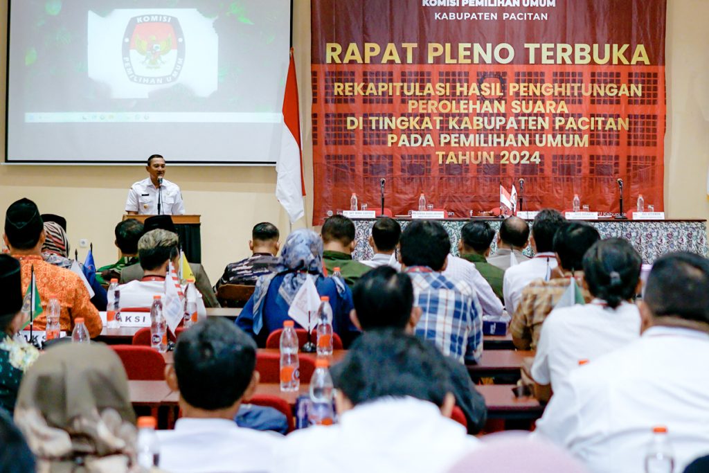 Rapat pleno terbuka rekapitulasi hasil penghitungan perolehan suara Pemilu Tahun 2024 tingkat Kabupaten Pacitan, resmi dimulai Rabu (28/2). Bupati bersama jajaran forkopimda, kepala dinas/instansi terkait, Bawaslu, saksi, pemantau hingga kalangan media, hadir secara langsung. Pun seluruh teman-teman PPK dan Panwascam se-Pacitan.